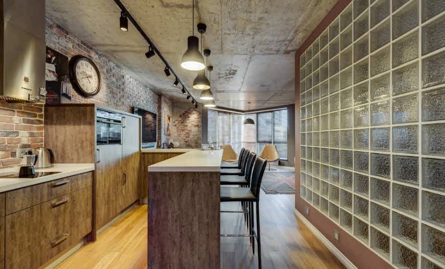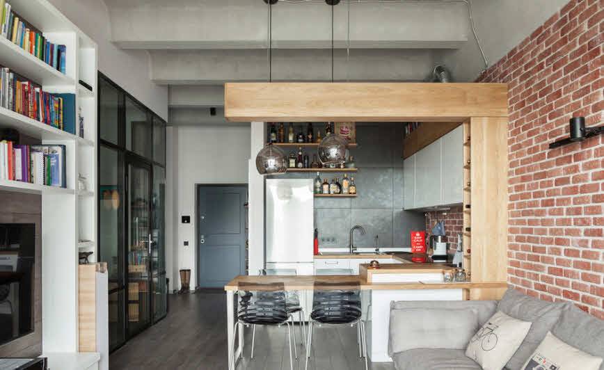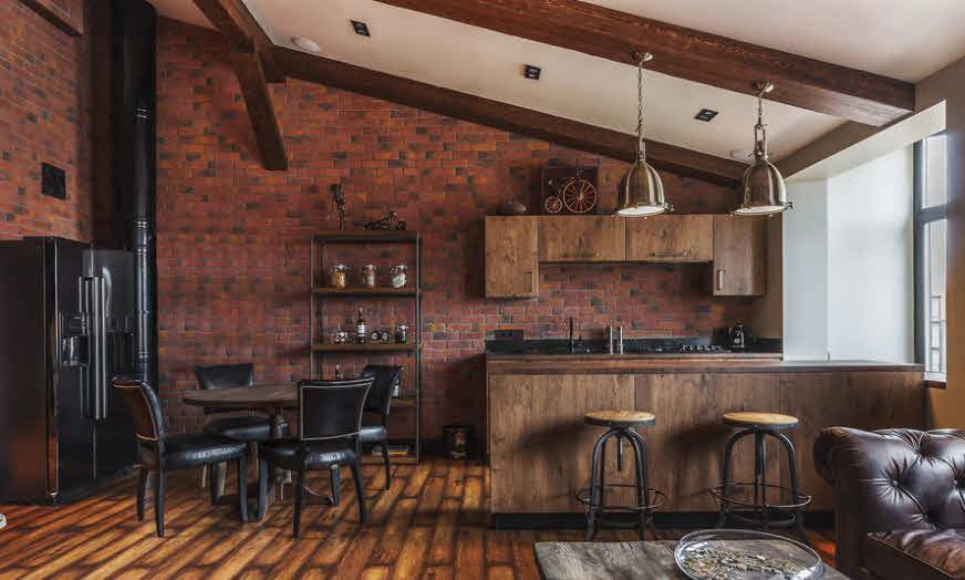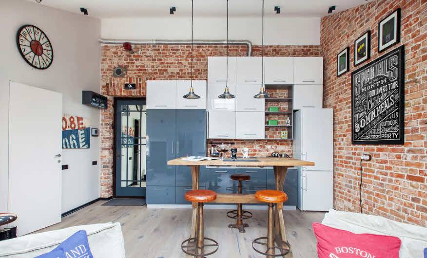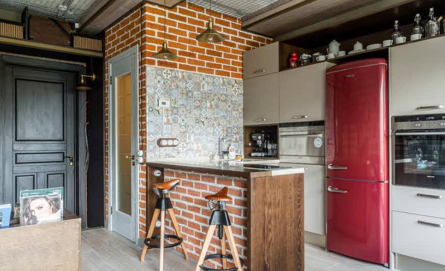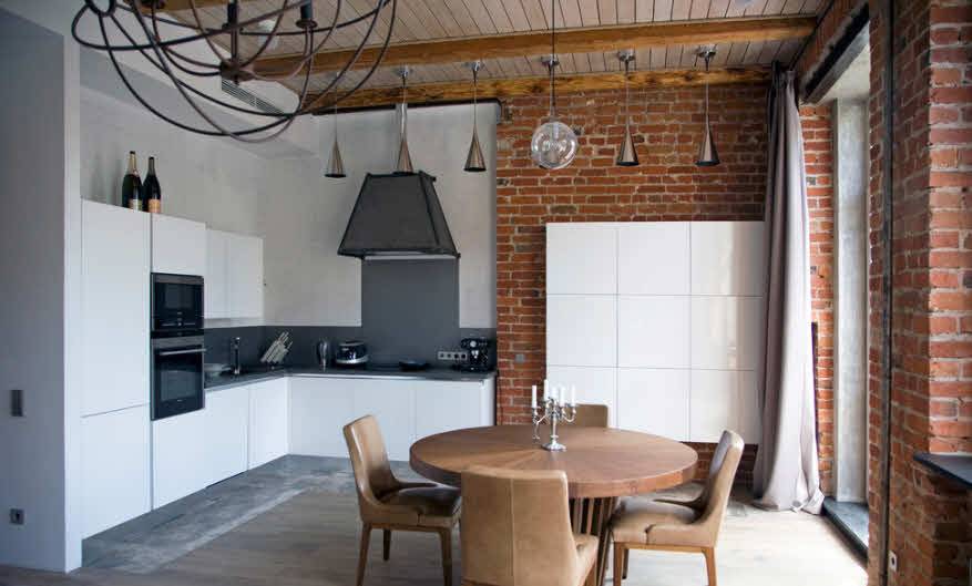 В кухне, оформленной в стиле лофт, самыми распространёнными останутся естественные кирпичные цвета, такие как-коричневый, черный, бело-серый, охристый.