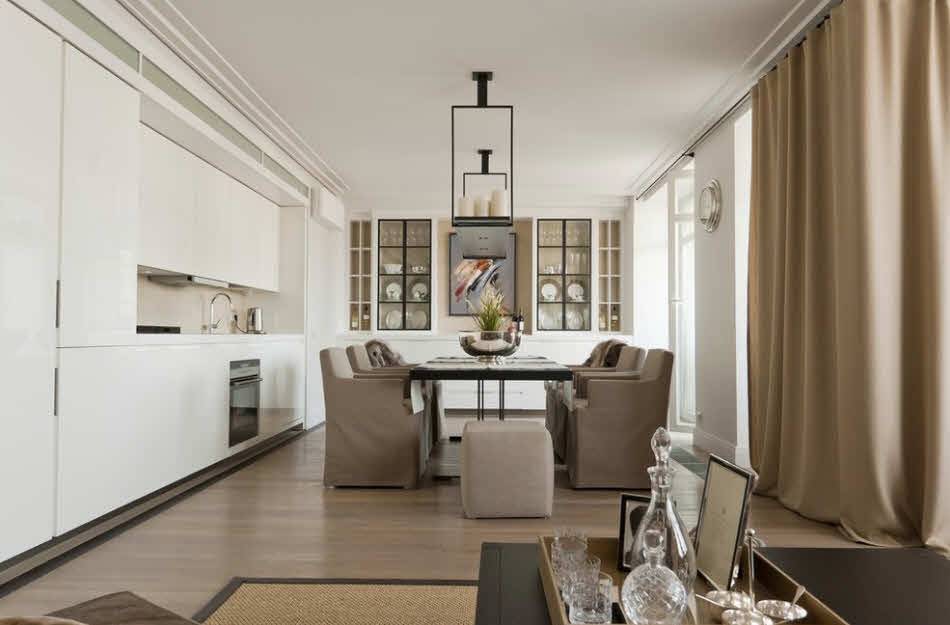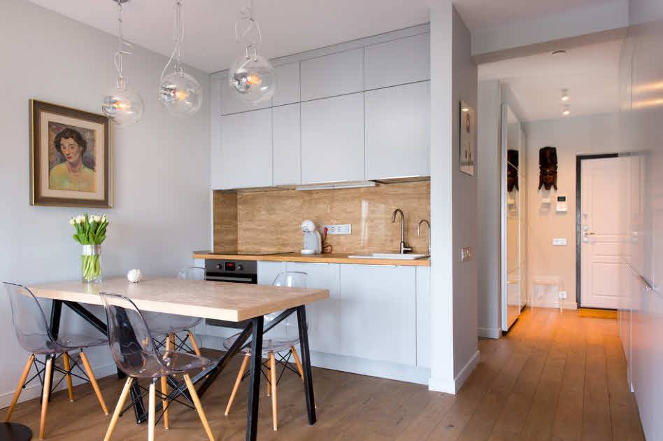 Радикальным решением станет совмещение кухни и гостиной, получив при этом квартиру-студию. Такая планировка особенно популярна среди молодежи. Кухня при этом расширяется и недостатки небольшой площади уже не столь заметны. К тому же обеденная зона может затронуть часть гостиной, за счет чего будет выиграно место для кухонного гарнитура и мебели, что придаст кухне большей функциональности и комфорта.