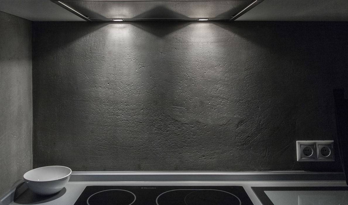 Стены, покрытые декоративной штукатуркой, смотрятся оригинально и дорого. Прекрасно сочетается с современной мебелью со вставками из алюминия.