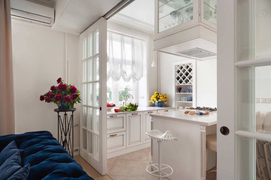 Чтобы этого избежать, можно избавиться от двери, обустроив вместо нее арку. Это сможет визуально расширить пространство и убрать чувство тесноты. В случае, если двери необходимы, одним из вариантов могут стать раздвижные модели, которые в добавок выглядят очень стильно и современно.