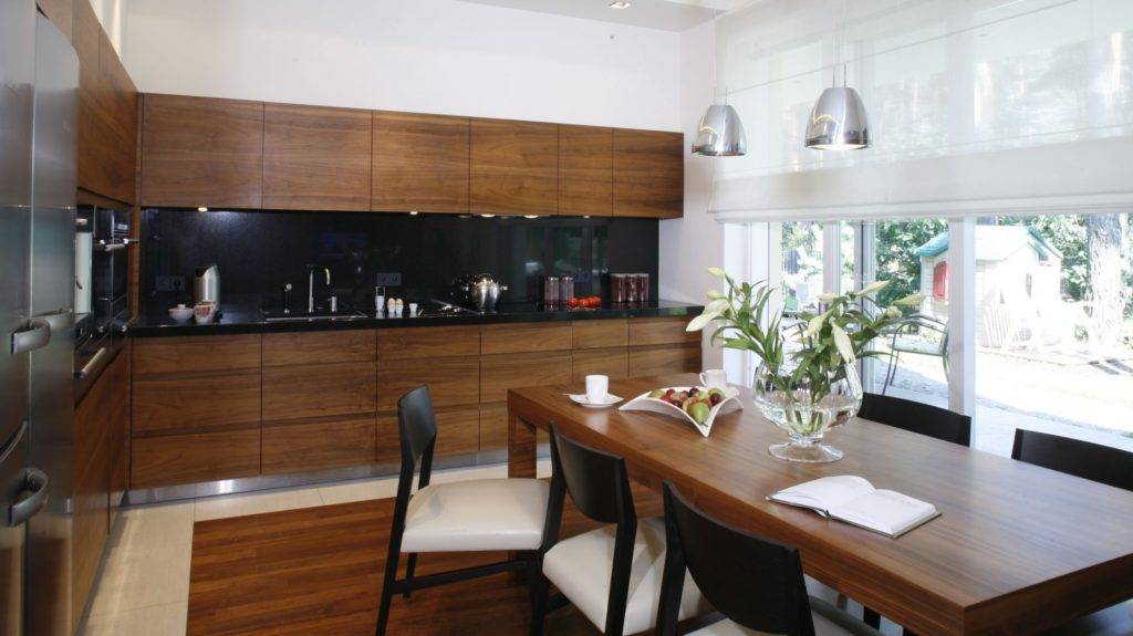 К примеру, можно установить темно-коричневый гарнитур с глянцевыми фасадами, дополнить его стеклянным фартуком с фотопечатью коричневых и белых оттенков. Столешницы могут быть белыми с разводами, напоминающими мраморную текстуру. Обеденный стол со стеклянной столешницей отлично впишется в такой ансамбль.