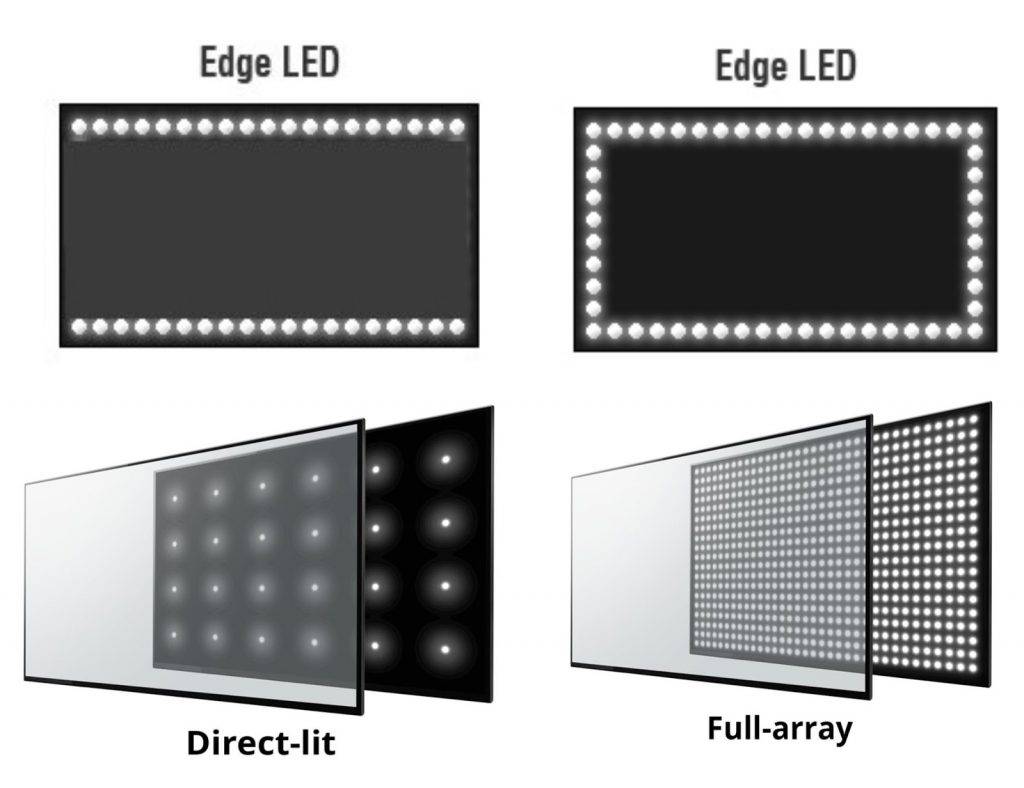 Стоимость и качество изображения будут также изменяться в зависимости от подсветки. Рассмотрим самые актуальные варианты, чтобы выбрать лучший. Подсветка Edge LED – встречается на многих современных ТВ с максимальным углом обзора. Светодиоды расположены по контуру дисплея, они являются подобием светящейся рамки. Это позволяет сделать устройство тонким и максимально экономичным.
