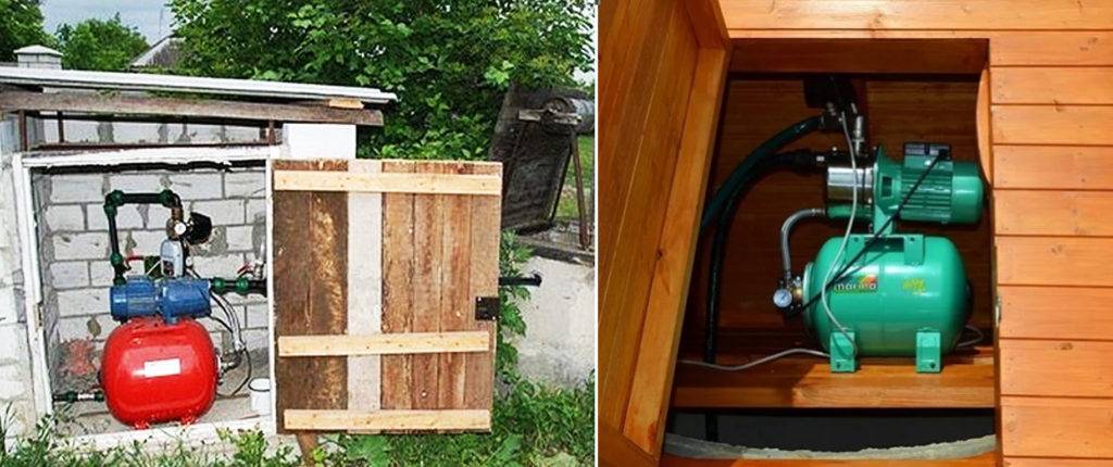 - Поверхностный насос помещают в укрытие. Для летнего использования достаточно сделать оголовок (крышу), но для круглогодичного потребуется постройка теплого, отапливаемого помещения.