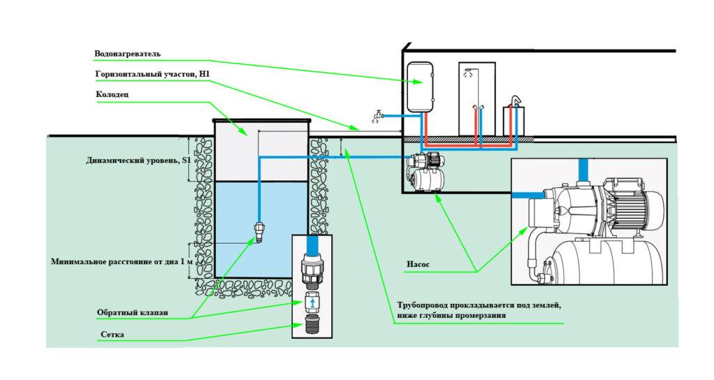 Любая из описанных схем водоснабжения частного дома реализуется при помощи насоса, подающего воду к дому. При этом должен быть сооружен трубопровод, соединяющий колодец или скважину с насосной станцией или накопительным баком. Существуют два варианта укладки труб — только для летнего использования или для всесезонного (зимнего).