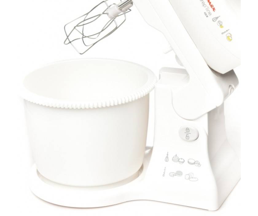 Тот случай, если нужен миксер для дома, но не то чтобы часто, да и денег на него жалко. Тогда можете приобрести этот недорогой прибор. Есть в кремовом и белом цвете. Дизайн с закосом под ретро. Комплектация вполне стандартная — венчики, крюки для теста. Устройство не очень мощное. Но еще раз повторимся, что взбить яйца или не очень тугое тесто этого вполне будет достаточно. Пользователям предлагается два основных режима работы. Первый мануальный: классический выбор скорости с первой по четвертую. Второй — турбо-режим, просто сразу включение на полную мощь. Из гнезд венчики вытаскиваются по нажатию кнопки.