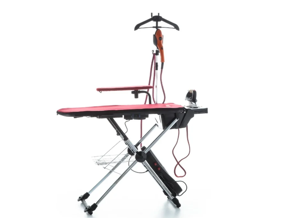 Тонкий изящный утюжок очень лёгкий. Длинный провод к базе, а также длинный шланг от базы к утюгу позволяют успешно отпаривать даже висящие шторы, не говоря уже об одежде. Нельзя доливать воду во время глажки, но это придирка. Недостаток здесь один: бойлер из тонкого пластика. Он красив, но вызывает опасения, что может треснуть.