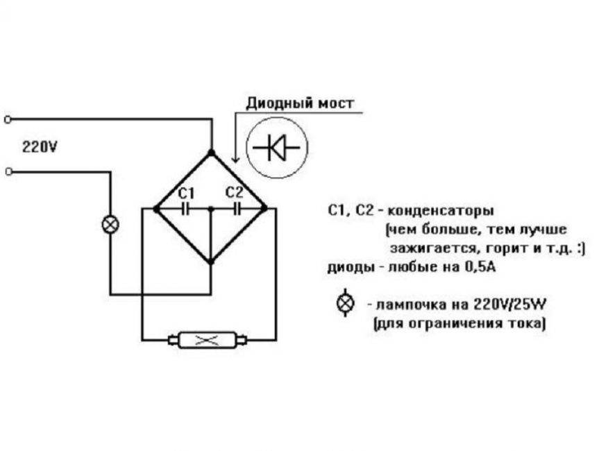 Следующая схема используется для лампочек с перегоревшими нитями. Однако отсутствует необходимость в повышающем трансформаторе, благодаря чему конструкция устройства становится проще.
