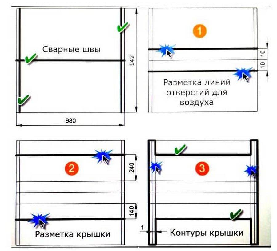 - Разметка отверстий или прорезей для притока воздуха должна быть произведена с учетом минимальной возможности их закупорки жировыми скоплениями от приготовления продуктов или золой. Отверстия должны способствовать удобному выходу продуктов сгорания и обеспечивать движение воздуха внутри агрегата.