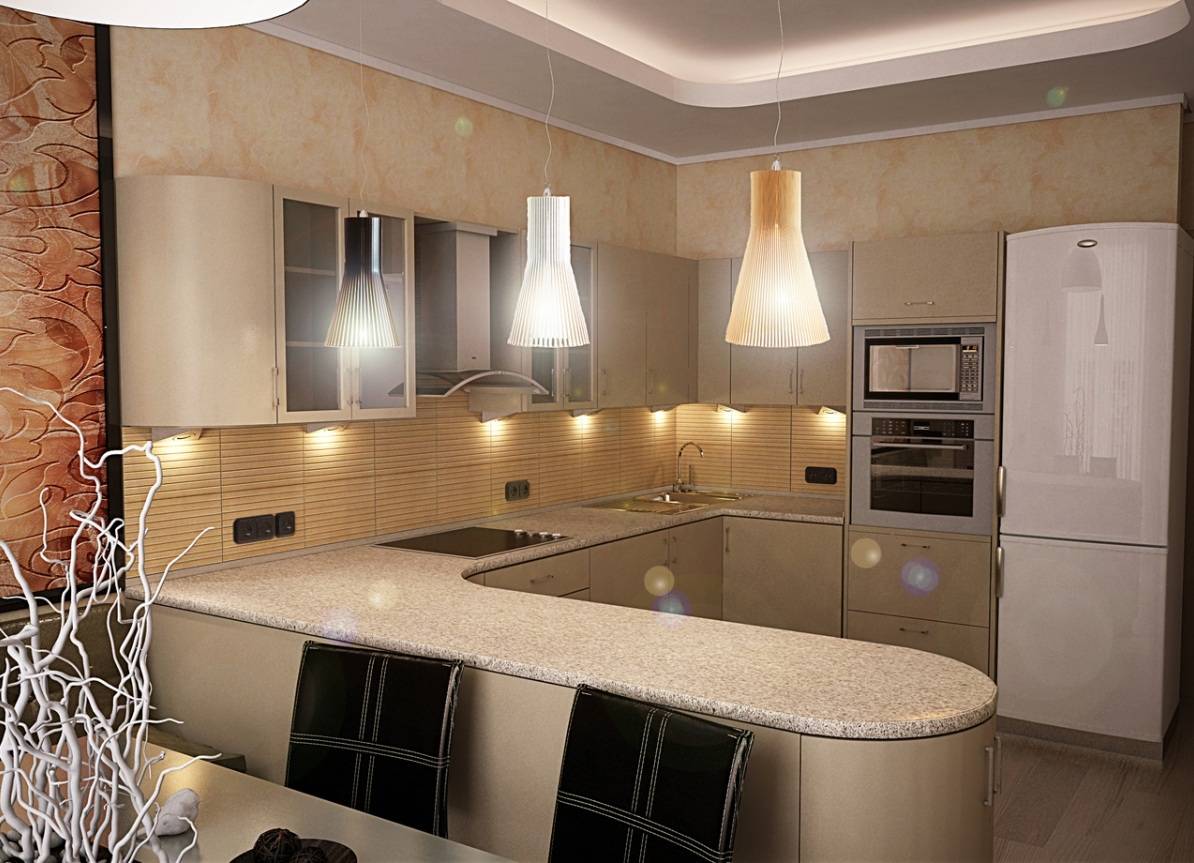 В современных интерьерах кухни используют также искусственный камень. Недостатком этого материала можно назвать лишь его высокую стоимость.