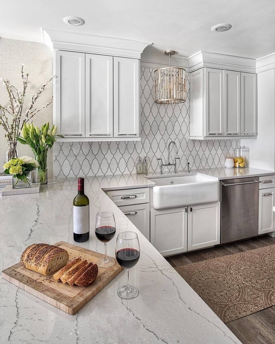 Кварцевый камень выглядит более дорого, наиболее приближен по внешнему виду к натуральному. По сути, он является природным материалом, так как на 90-95% состоит из кварцевой крошки, которая соединяется прессовкой и специальными смолами. Сюда добавляют красящие пигменты, что позволяет добиться любого цвета и рисунка.