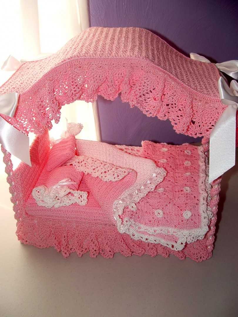 Первый элемент декора для кукольной кровати — постельное белье. Декорируют изготовленную мебель при помощи цветной бумаги, пуговиц, бусинок, бисера, ленточек, цветного картона, сушеных цветов, блесток, звездочек и так далее.
