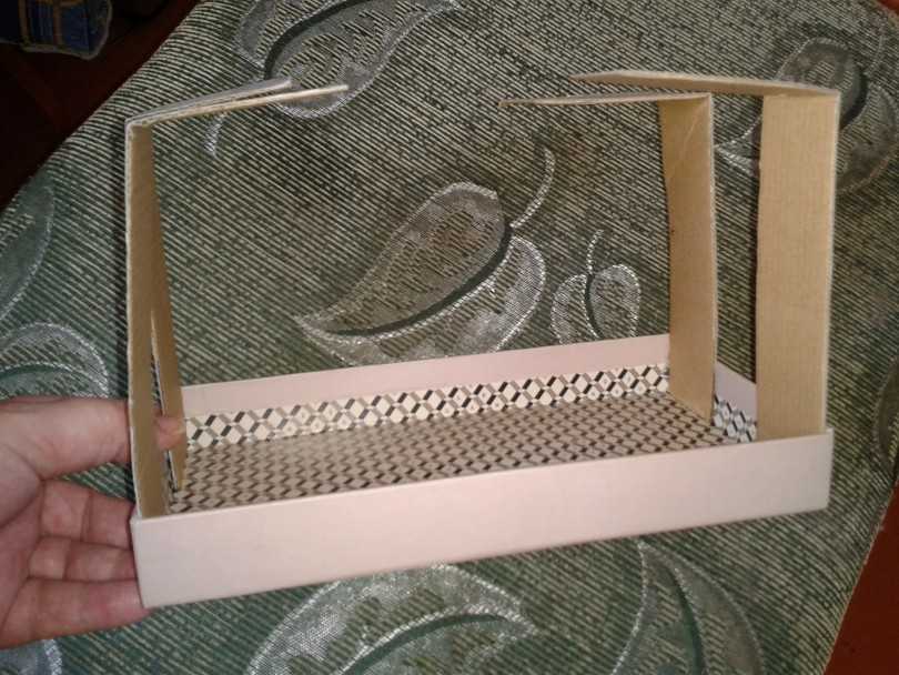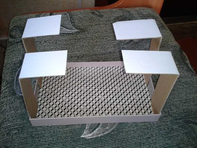 - На обеих сторонах крышки коробки рисуются ножки, оптимальная высота которых составляет 3–4,5 см. Лишний картон обрезается. При желании можно изготовить дополнительную опору.