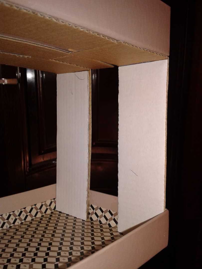 5. Чтобы получилось две комнаты внизу, нужно сделать перегородку из куска картона. Приклеить ее можно с помощью плотной бумаги, которая заменит строительные уголки в бумажном домике. Также можно оформить потолок на втором этаже. Для этого используйте остатки реальных обоев.