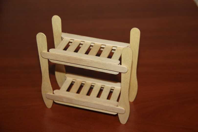 Все опорные детали выполняются в соответствии с выбранной схемой. В результате получается надежная двухъярусная кроватка для кукол. Отличным дополнением модели станет яркое постельное белье, которое можно сшить своими руками.