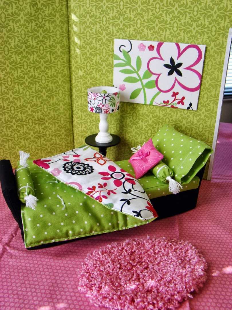 На завершающем этапе постель для кукол из картона обклеивается салфетками из вискозы, бумагой либо тканью. Спальное место станет еще более привлекательным с декором в виде цветочных аппликаций. Реалистичность изделию придадут миниатюрные постельные принадлежности: матрас, подушки, одеяльце.