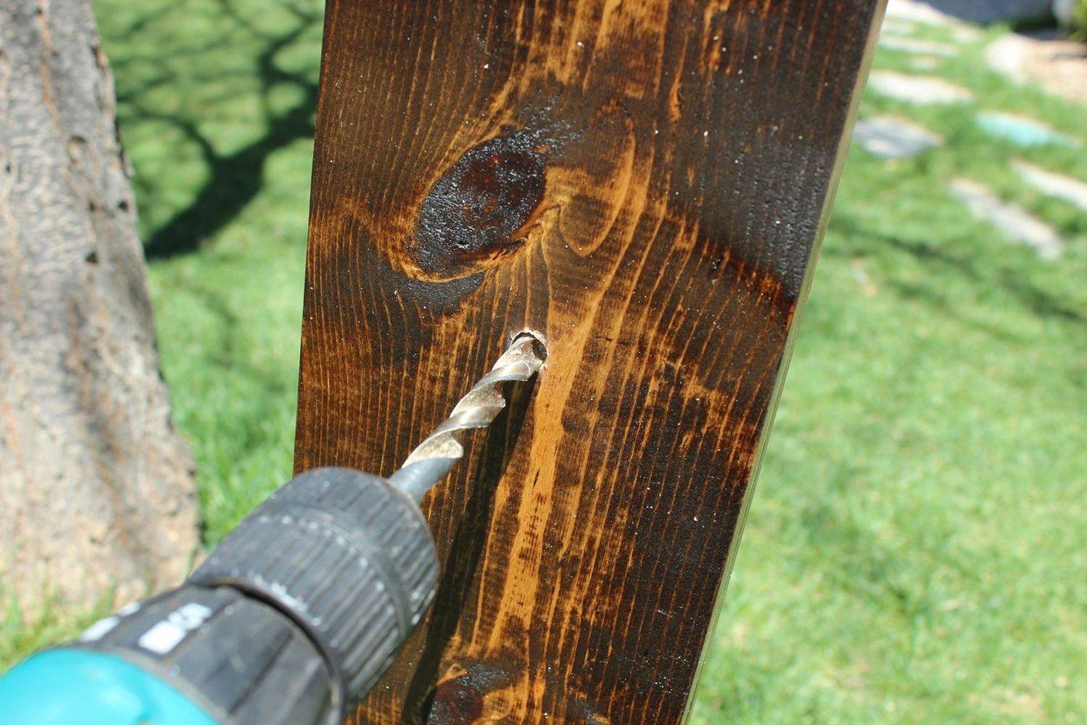 Шаг 8. В металлическом каркасе и в деревянных заготовках под спинку и сидение нужно высверлить отверстия одного диаметра, которые должны совпадать друг с другом при примерке того же сидения к каркасу.