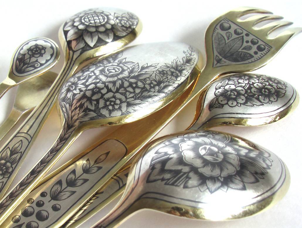 Ложки с натуральным золочением используются только для особых случаев. Самыми популярными экземплярами остаются изделия Кольчугинского завода. Во многих странах эта продукция известна как «Кольчугинский Мельхиор».