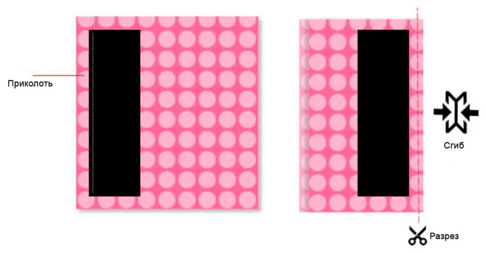 Добавляем вокруг кусочка по 2,5 см вверху и по бокам и 5 см внизу нашей приколотой ткани.