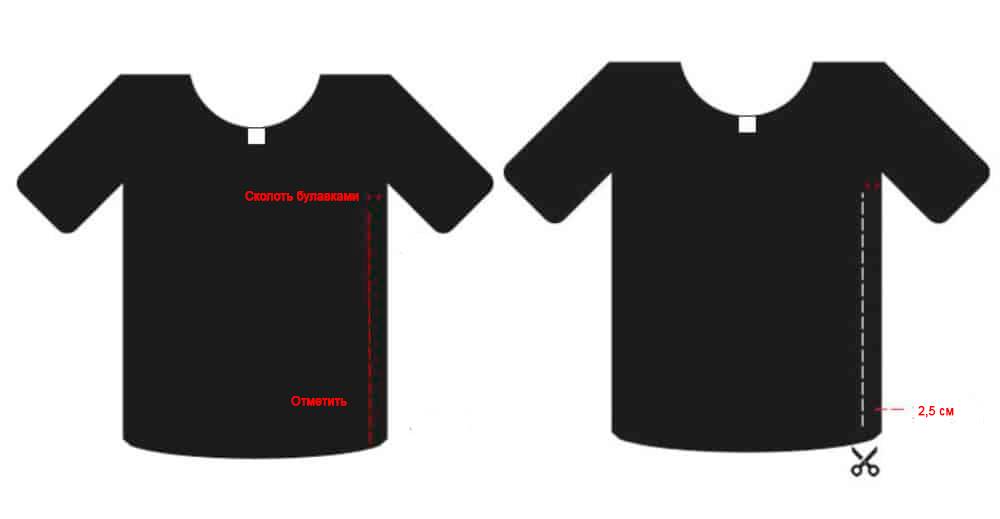 Выворачиваем футболку наизнанку и ищем, где шов рукава переходит в боковой шов футболки. Отмеряем 1,5 см от этой точки вниз и отмечаем булавкой.