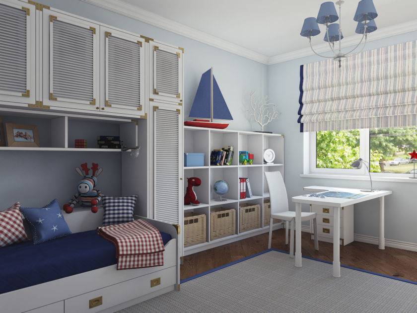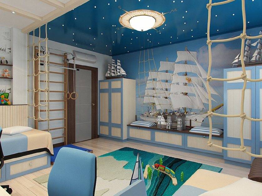 В их комнатах можно использовать более серьезные элементы декора: карта на всю стену или схема вязания морских узлов, глобус, подзорная труба, компас, свисающие с потолка канаты. Приветствуются модели кораблей, изготовленные ребенком.