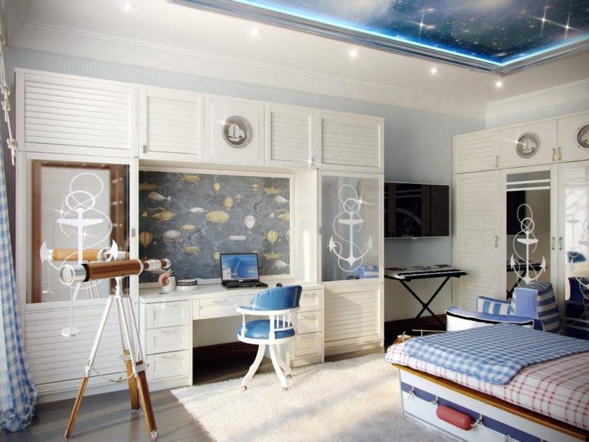 | Корабельная тема | Основами остаются синий и белый цвета, но можно сделать акцент и на красном. Мебель подбирают в классическом стиле из темного дерева. В оформлении желательно использовать корабельную атрибутику – штурвал, якоря, барометры или каютные часы, рынды, сигнальные флажки. Комнату можно превратить в мини-парусник или каюту |