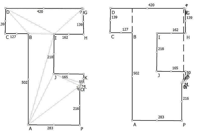 - После построения эскиза требуется разбить полученную фигуру на треугольники. Для этого измеряют диагонали и на чертеже проводят соответствующие линии с указанием размеров.