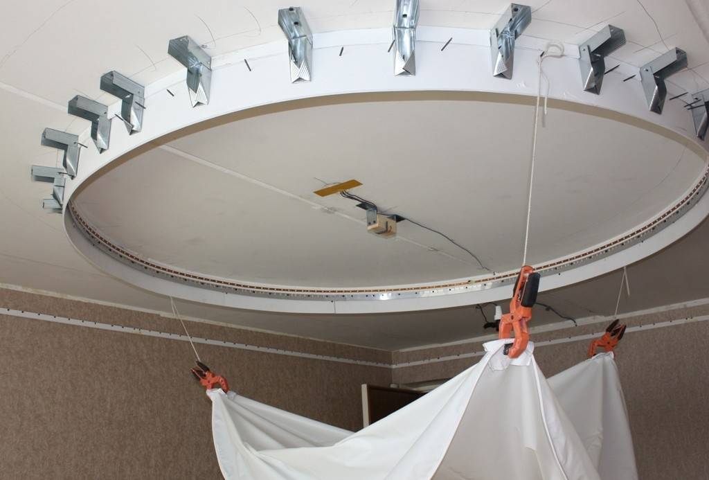 Этот способ считается одним из самых дорогих и в то же время простым и надежным методом фиксации натяжных покрытий. Перед началом работ нужно предварительно провести точные расчеты. Профессионалы используют для этого специальные компьютерные программы. В процессе изготовления полотнища допускается погрешность в несколько миллиметров. Нельзя проводить какие-либо корректировки на месте. Поэтапная процедура выглядит следующим образом: