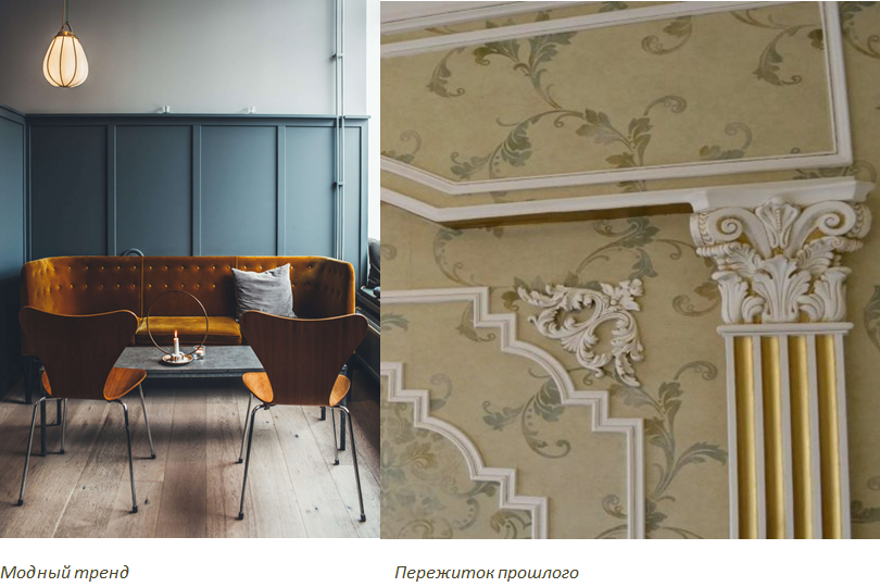 Тот же прием очень хорошо работает, когда приходится стыковать два цвета или две фактуры. Для разделения и гармонизации стыков используют молдинги. Это может быть акцентная стена, что сейчас очень модно.