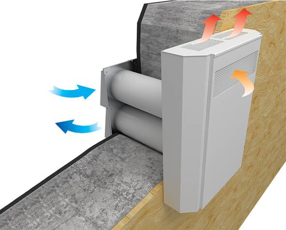 В локальных рекуператорах предусмотрен вентилятор и пластинчатый теплообменник. «Рукав» приточника изолирован шумопоглощающим материалом. Блок управления компактных вентустановок размещается на внутренней стене