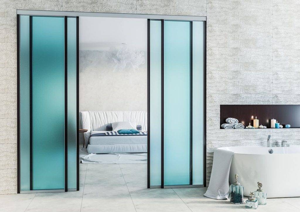 Раздвижные конструкции не отличаются от дверей-аналогов, монтируемых в шкафах-купе. В зависимости от модели они имеют от 1 до 4 створок. К достоинствам относят компактность системы, из-за чего такие полотна можно устанавливать в условиях ограниченного пространства, удобство в использовании, практичность. Недостатки раздвижных створок — сложный монтаж, частая поломка роликового механизма.