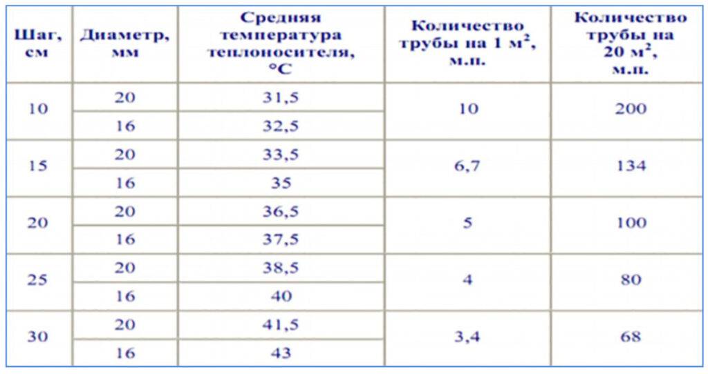 В соответствии со СНиП 41-01-2003 в жилых помещениях средняя температура пола должна быть 26°С, а в нежилых – 31°С, как и в комнатах с повышенной влажностью, таких, как ванная. Над трубой максимальная температура пола составляет 35°С.