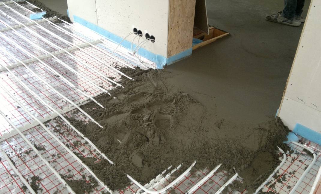 После испытания системы давлением воды, приступают к окончательному завершению монтажа. Последний этап всей работы – финишная заливка пола.