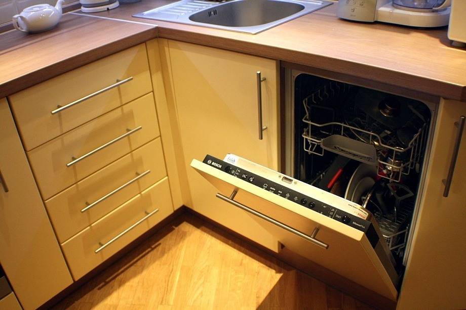 Компактную посудомойку можно встроить в нишу, спрятать в одном из модулей либо просто поставить на столешницу.
