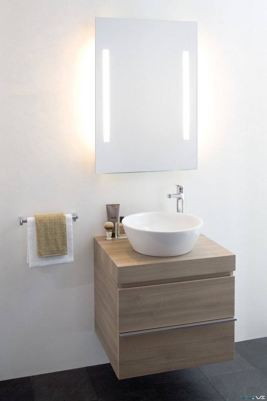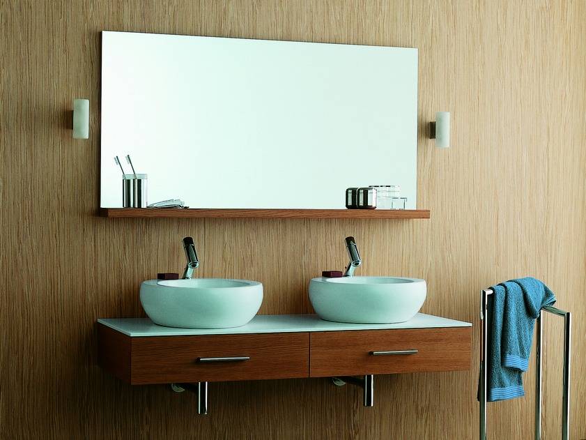 Мебель из МДФ под дерево или из натуральной древесины отлично смотрится, если стены ванной обшиты панелями в том же стиле. Подходит она и для комнаты с деревянными стенами. Деревянный шкафчик под накладной раковиной в ванной следует покрыть специальным лаком. Кроме того, для предотвращения гниения древесины и появления грибка желательно обновлять лакировку раз в 3–5 лет и обеспечить эффективную вентиляцию.