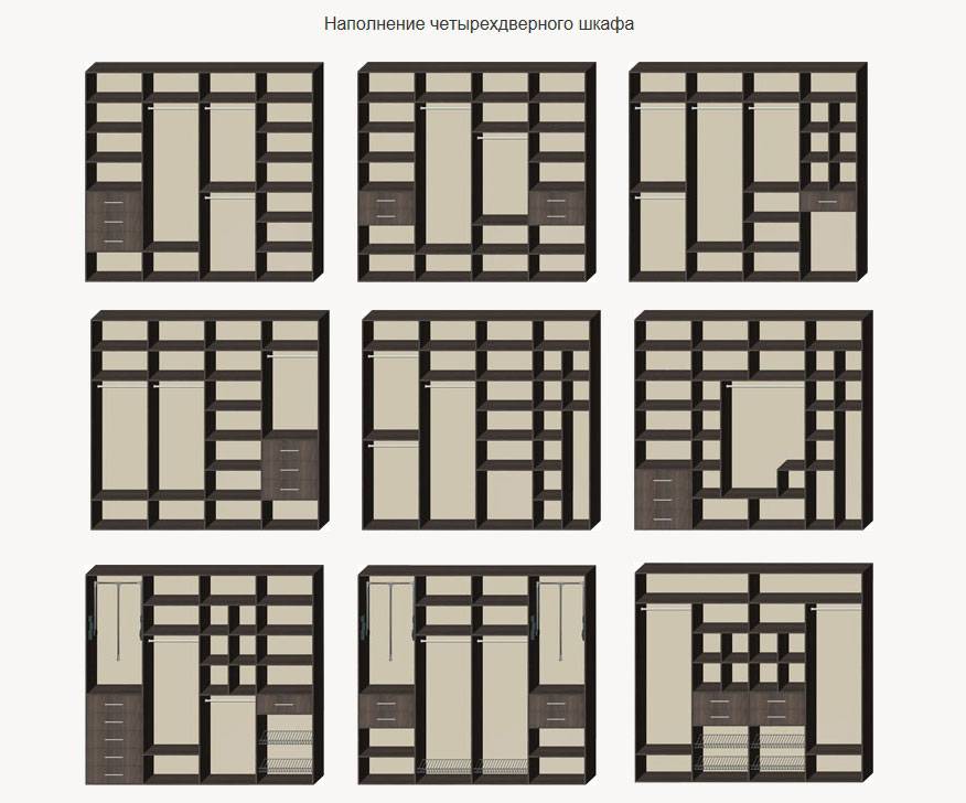 Внутреннее наполнение шкафов не имеет стандартных схем. Все зависит от потребностей хозяев, размеров шифоньера, его конфигурации и места расположения.
