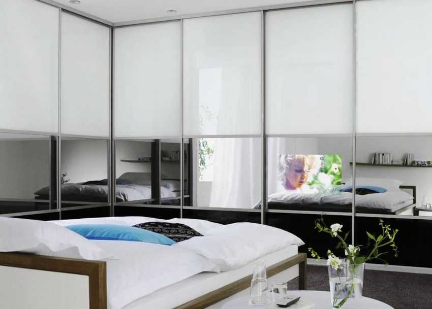 На фото спальная комната с интересным наполнением шкафа-купе: в центральной части изделия встроен компактный телевизор.