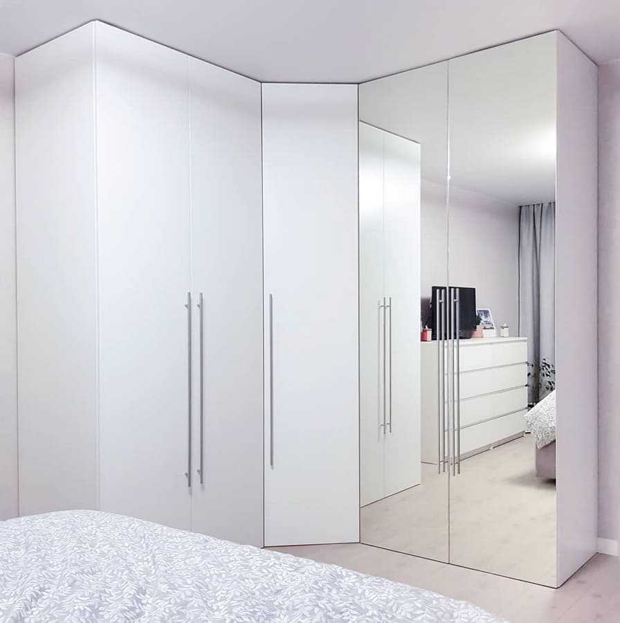 Наполнение угловых моделей усложняется невозможностью полноценно использовать зону в углу шкафа купе. Еще сложнее по наполняемости радиусные модели углового типа с выпуклыми/вогнутыми фасадами. Кромка полок должна повторять очертания радиальных фасадных панелей. Этот момент также влияет на вместительность шкафа купе.