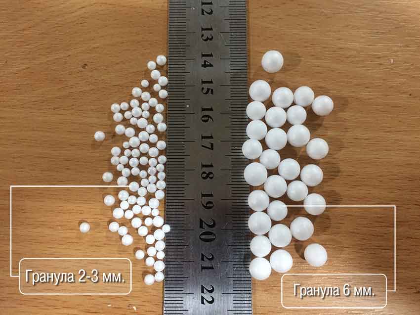 Используются шарики с диаметром в 2–5 миллиметров. Из недостатков можно отметить малый срок эксплуатации наполнителя из пенополистирола. В зависимости от интенсивности эксплуатации, срок службы может колебаться в пределах 3–12 месяцев.