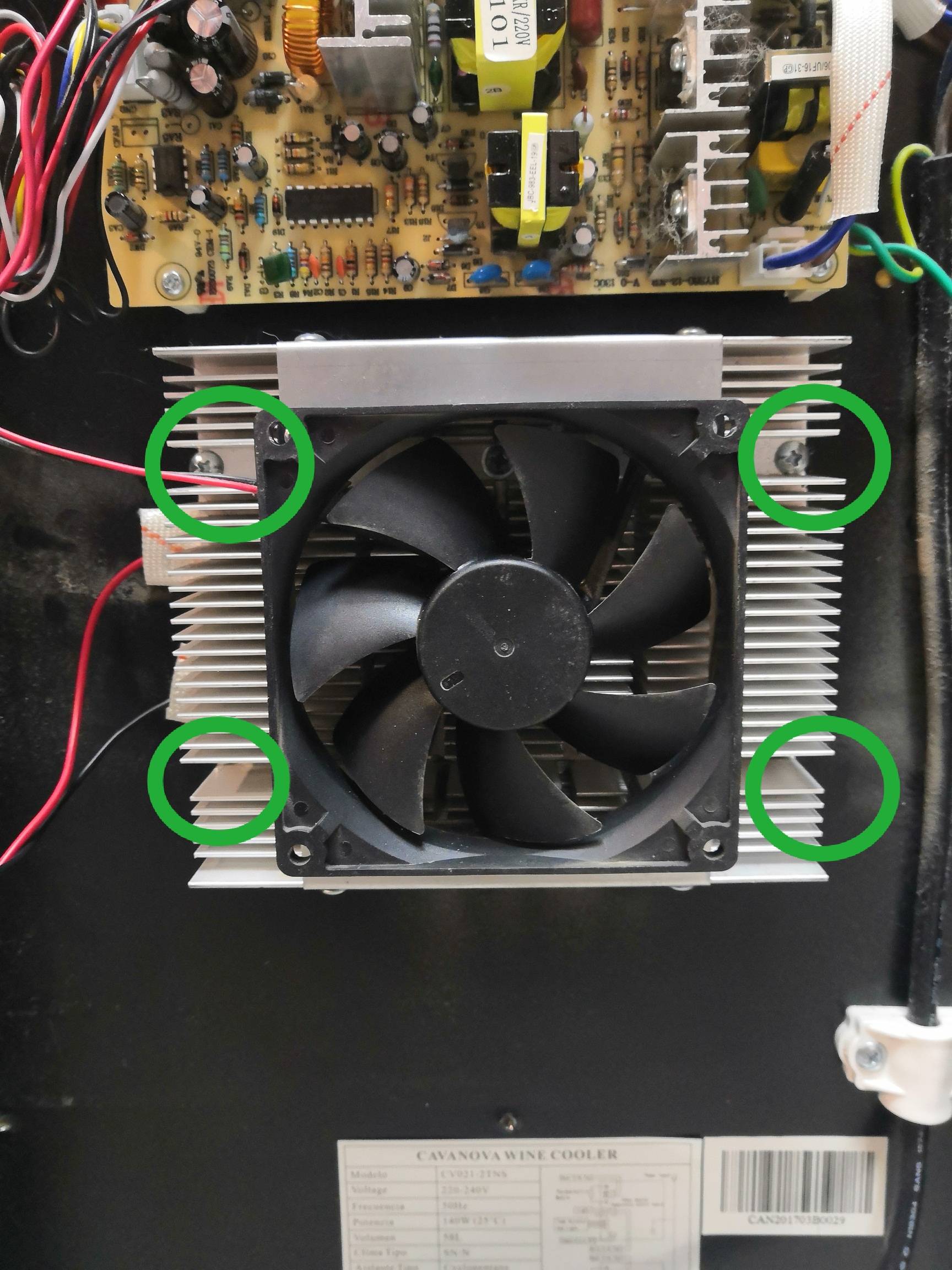 Элемент пельтье с одной стороны, которая обращена внутрь камеры винного ларя – охлаждает, а с другой нагревается, для охлаждения внешней стороны этого элемента устанавливается мощный алюминиевый радиатор, хорошо смазанный термопастой для лучшей теплопроводности.