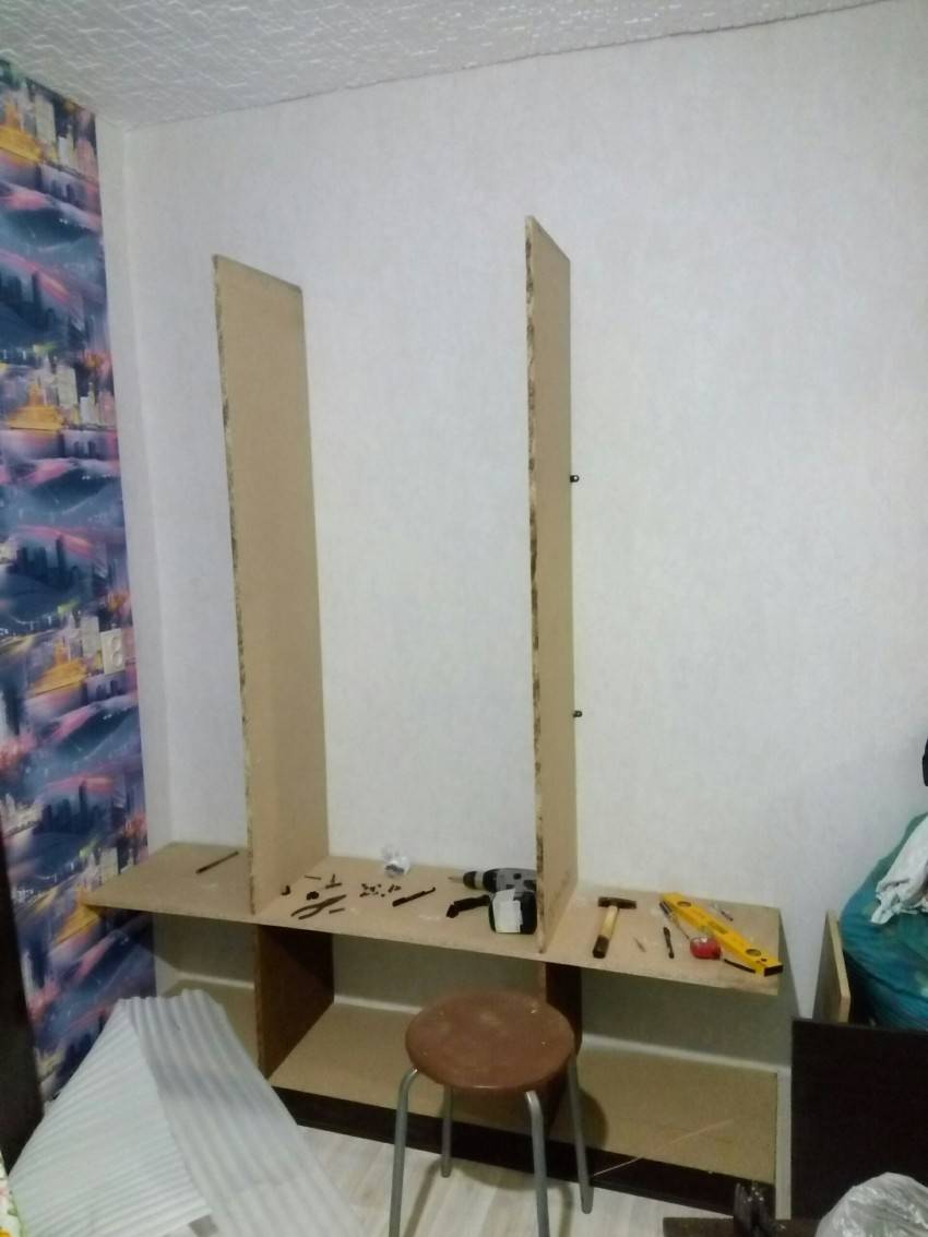 - К нижней полке крепится левая торцевая часть, соединённая саморезами. Затем монтируют правую торцевую доску.