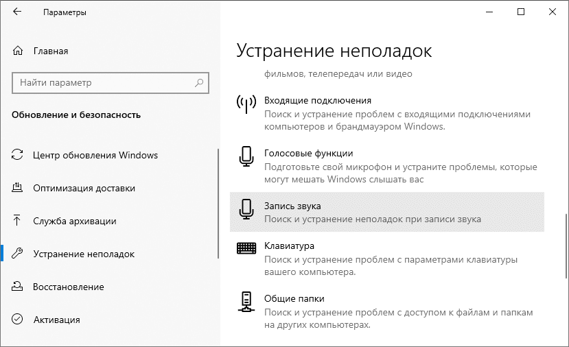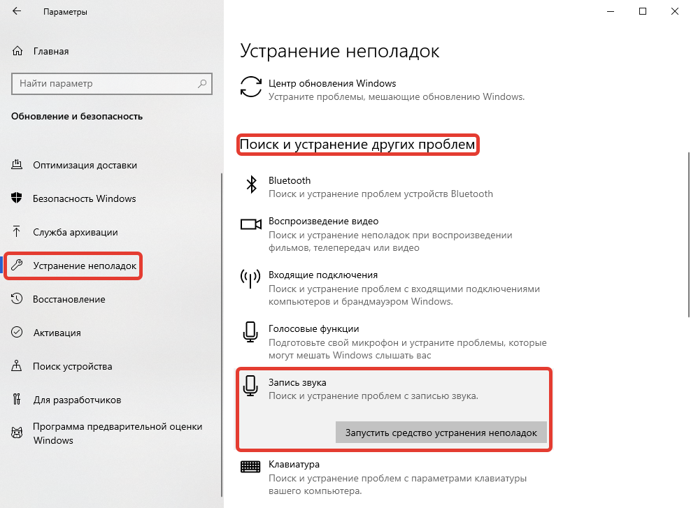 - Откройте вкладку «Устранение неисправностей» и в блоке «Другие неисправности» нажмите кнопку «Запись звука».