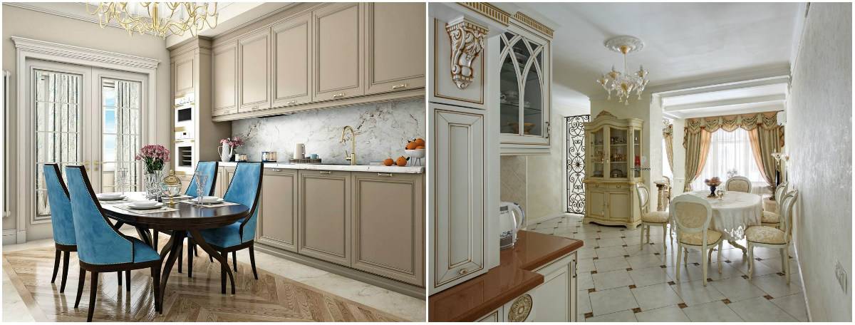 Интерьеры кухни или столовой в стиле неоклассики отличаются обилием натуральных материалов, использованием фарфоровой посуды, отчасти вычурным декором.