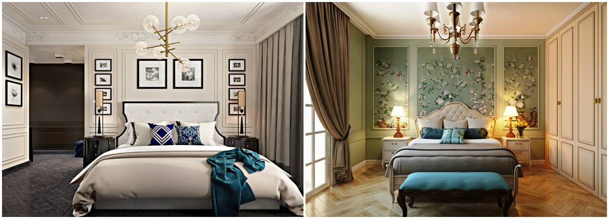 Массивная деревянная кровать украшается простым резным декором, небольшим изголовьем или стилизованными колоннами. По бокам ставят прикроватные тумбы-столики и бра с хромированными или позолоченными корпусами, мягкие кресла. Ассиметрично можно поставить небольшой диван с креслом, торшер, банкетку и небольшой коврик в изножье кровати, комод. Удачно впишутся в интерьер встроенные гардеробные, туалетные столики, напольные зеркала, тяжелые люстры, картины и вазы.