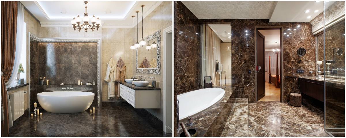 Для создания неоклассической ванной не подойдет маленький санузел – понадобится просторное и светлое помещение. В интерьере можно совместить классические и современные архитектурные элементы. Это и стилизованные полуколонны, обрамляющие массивную ванну на изогнутых ножках, и ниши, в которых поместится косметика и текстиль, и постаменты, удобные для зонирования и размещения душевой.