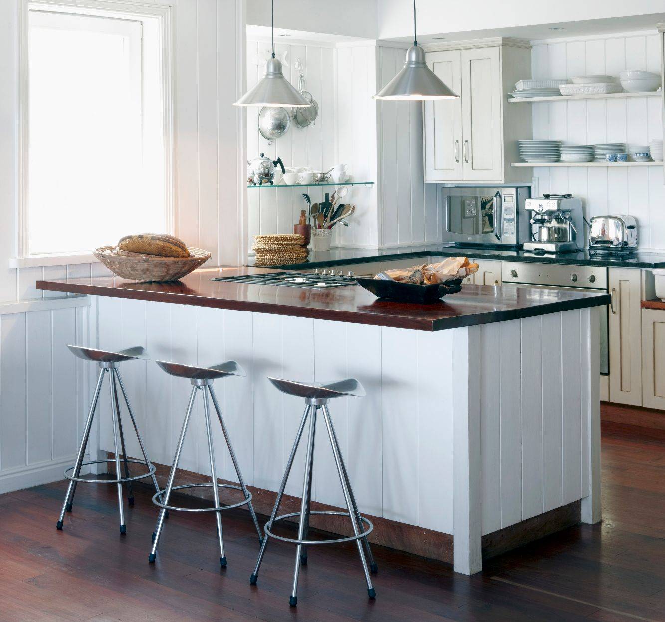 В современной кухне нередко барная стойка выступает в качестве обеденного места. Она удобна как для перекуса, так и для повседневных приемов пищи. Барные столы и стулья для кухни устанавливаются как перпендикулярно, так и параллельно линии гарнитура. Обеденную зону можно оформить в виде острова или наоборот расположить вдоль стены, скомбинировать вместе с подоконником – все зависит от габаритов помещения.