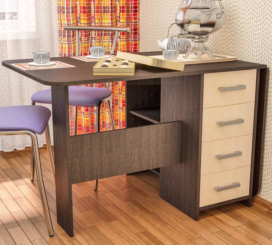 Раскладные кухонные варианты оборудуют складными опорами, откидывающимися ножками. Компактные варианты приобретают для студий, небольших квартир.