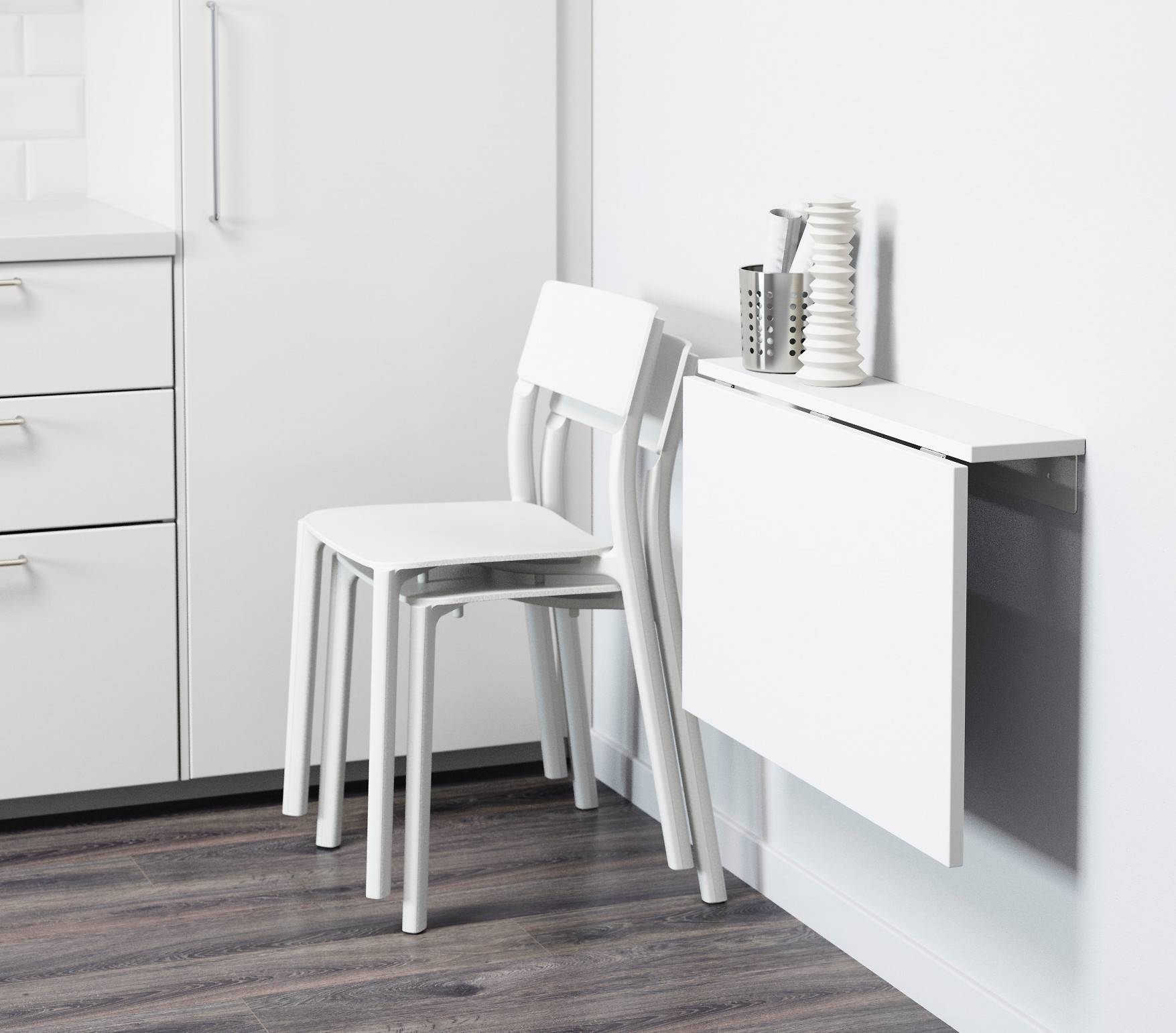 Удобная мебель для кухни (столы и стулья, способные менять конфигурацию) придумана с целью экономии пространства. Есть много вариантов трансформации вертикальной плоскости. В маленькой кухне используются: