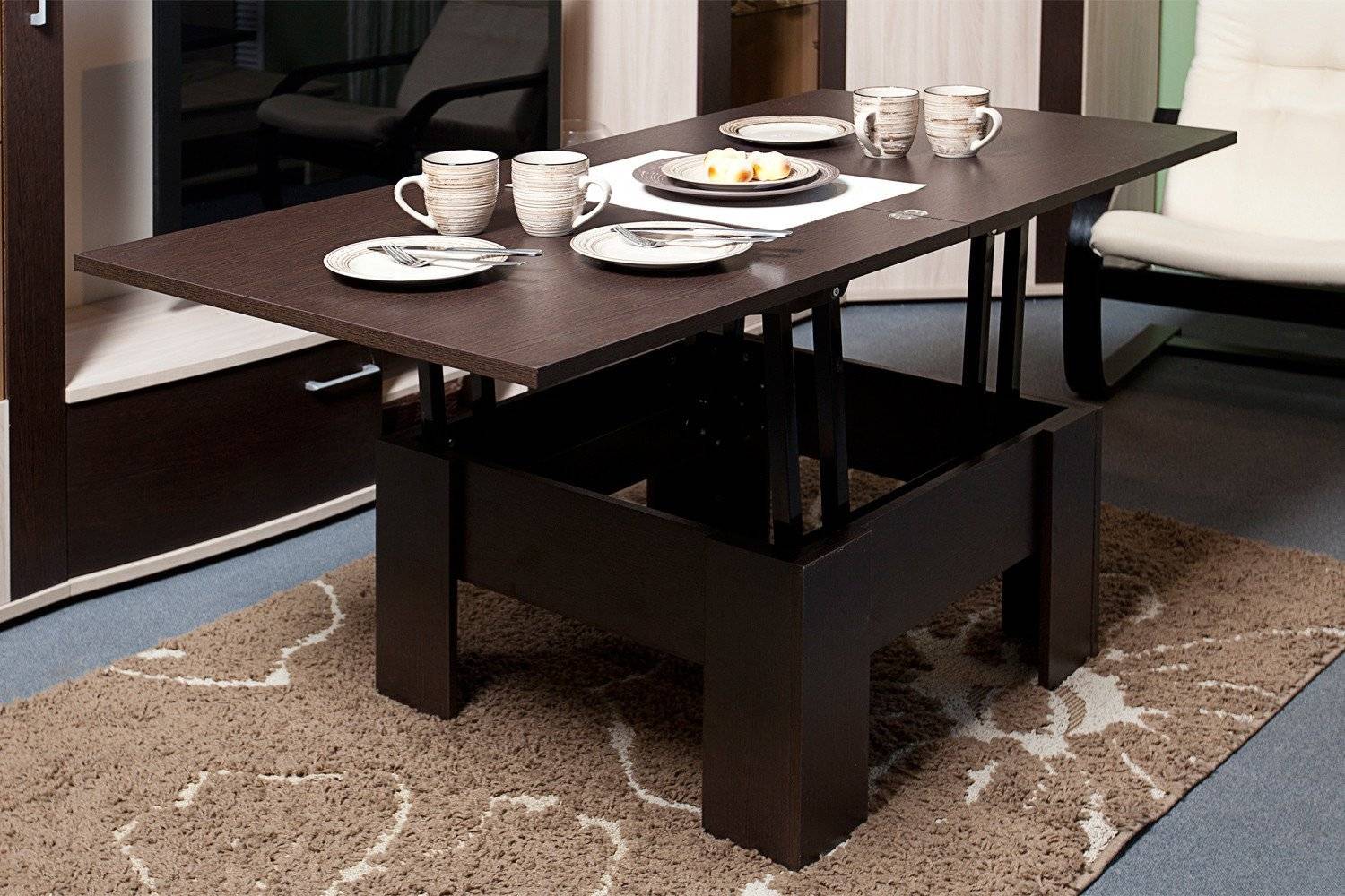 Многофункциональные трансформеры выполняют сразу несколько функций. Производители предлагают модели с регуляторами высоты опорной стойки. Небольшой журнальный или чайный столик превращается в полноценный и красивый обеденный стол стандартной высоты.