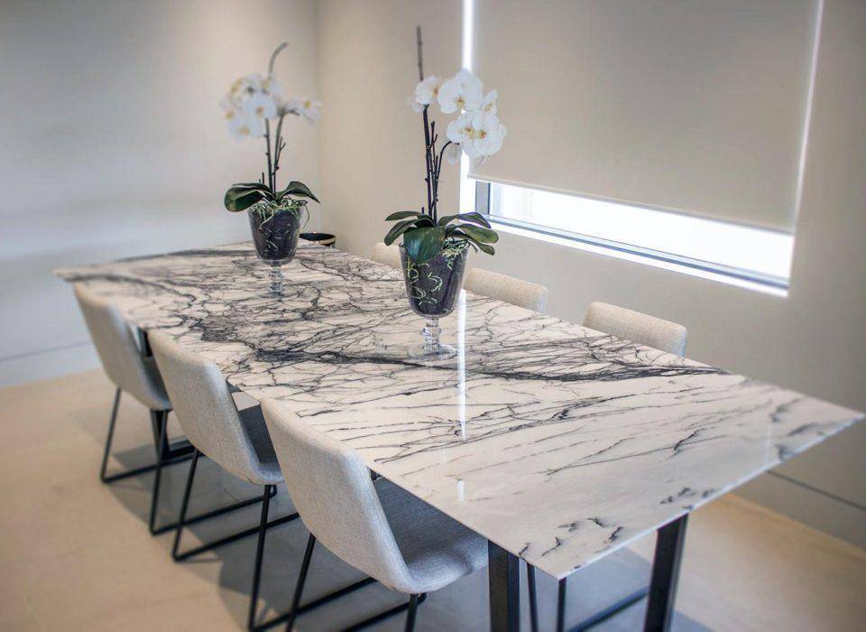 Столы для кухни из камня отлично дополнят средиземноморскую концепцию, модерн и рококо. В средиземноморском дизайне конструкция может быть белой или бежевой, а также столешница иногда выполняется в голубом или зелено-голубом цвете.
