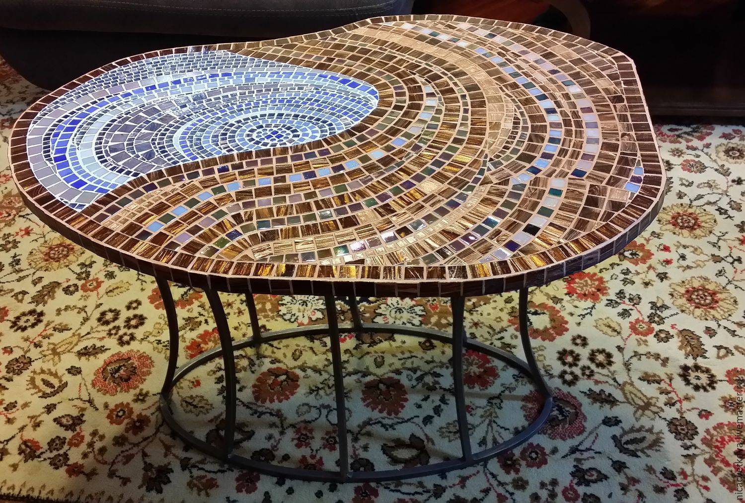 В последнее время появились столы, декорированные плиткой или мозаикой. Узоры могут украшать только центр столешницы, располагаться по краям или покрывать всю крышку мебели. Есть раздвижные и нераздвижные модели. Плиточный орнамент выглядит очень нарядно и, в зависимости от рисунка, может органично вписаться почти во все существующие стили.